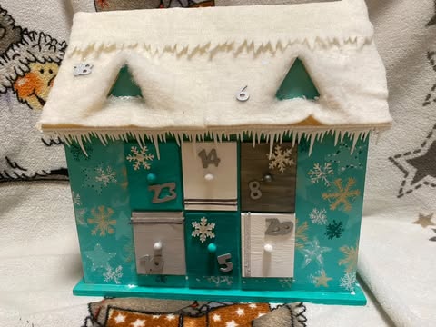 Adventskalender zum Selbstbefüllen aus Holz. Besonderes Detail: Gaubenfenster mit Leuchtfarbe verziert.